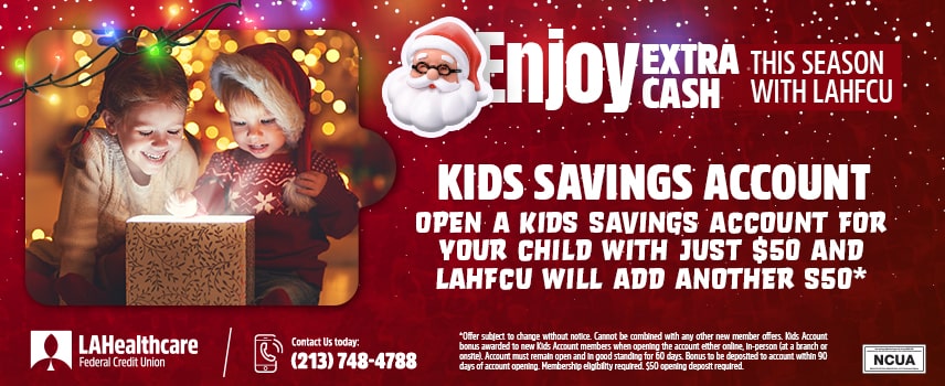 Enjoy extra cash this season with LAHFCU - Open a Kids Savings Account with just $50 and LAHFCU will add another $50 - Check Kids Savings